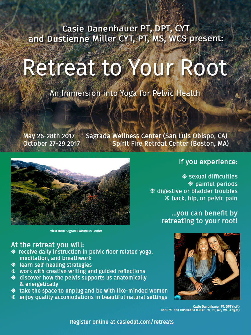 A few months ago I had the opportunity to join a yoga for pelvic health workshop put on by Casie Danenhauer, PT, DPT and CYT, and it was amazing! Now Casie is teaming up with another pelvic floor physical therapist and yogi, Dustienne Miller, CYT, PT, MS, WCS, to put on a yoga for pelvic health retreat! I am really excited about this because I received such a benefit from the 2-hour workshop, but the value from a full weekend will be exponential.